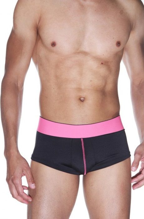 Мужские хипсы из эластичной черной ткани, с розовыми строчками и широким розовым поясом.
