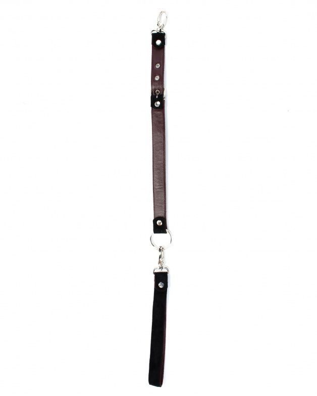 Поводок с одной стороны выполнен из натуральной кожи, а с другой стороны - из замши. Длина изделия регулируется металлической пряжкой, карабины и кольцо надежно фиксируют в подчинении, обеспечивая погружение в сладкий мир ограничений.